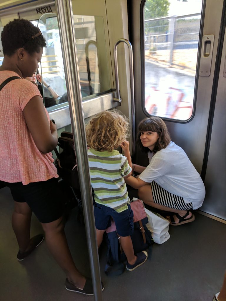 We walked from our apartment to the Rossio train station, then rode for about 30 minutes to Sintra. No seats for us — so we gave the kids breakfast and entertained them on the floor.